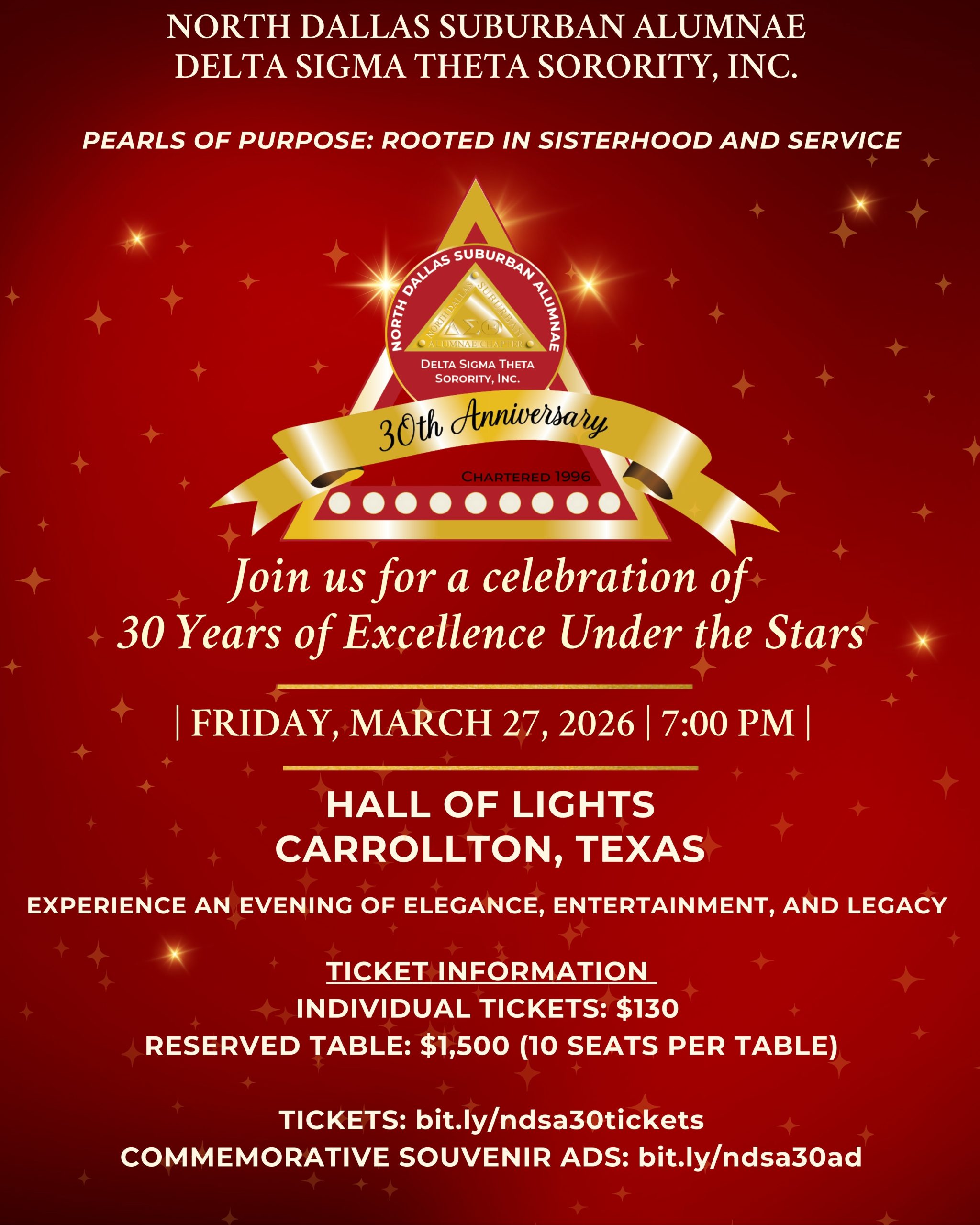 Join the North Dallas Suburban Alumnae Chapter of Delta Sigma Theta Sorority, Inc. as we celebrate 30 years of excellence under the stars. The event will be held Friday, March 27, 2026, 7 p.m. at Hall of Lights (4421 Charles St, Carrollton, TX 75010).